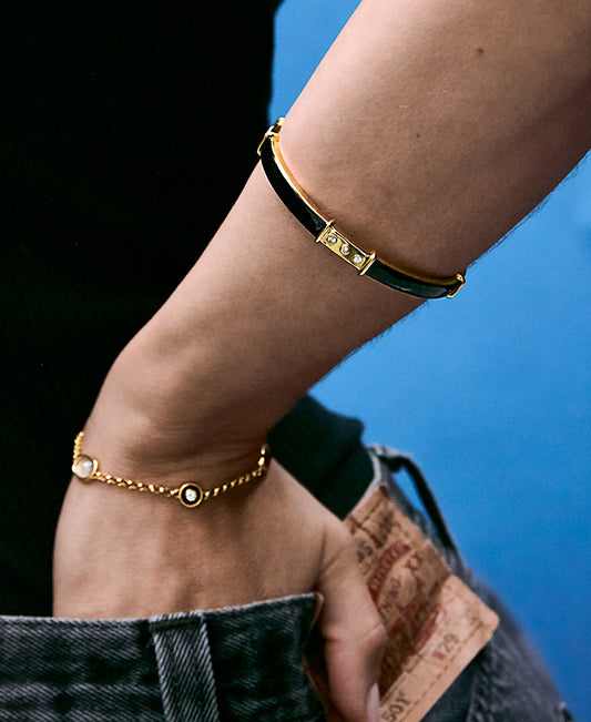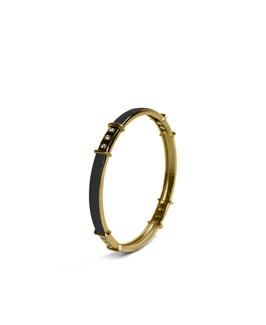 This piece features small sections adorned with 2mm Cubic Zirconia stones, paired with larger sections that are carefully hand-painted with Jet color enamel.