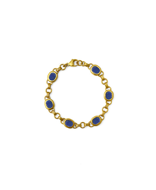 Lapis Lazuli stones embellishing the delicate stations that make up the sections of the bracelet. This is a semi-precious stone that is believed to encourage inner peace and self-awareness. It also gives protection against negative energies and wards off evil.