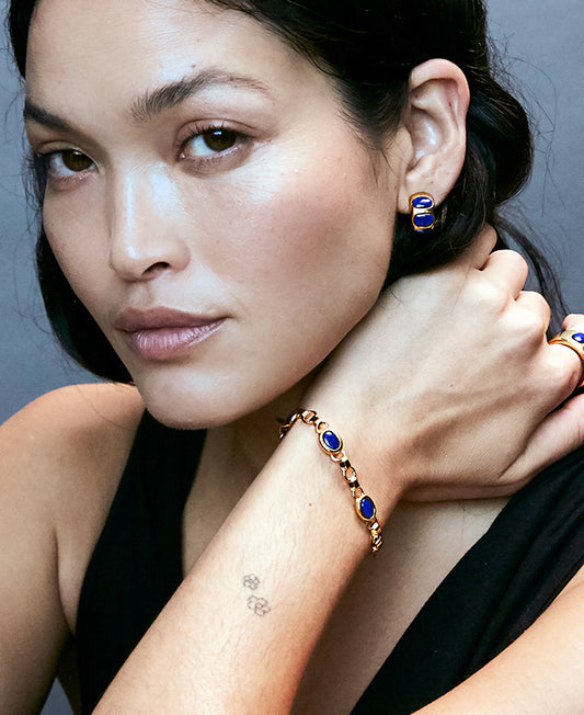 The sleek, minimalist design makes it a versatile accessory, perfect for elevating both everyday outfits and formal ensembles. Whether worn alone or layered with other pieces, the timeless elegance of this bracelet adds a touch of luxury and sophistication to your collection. Wear it with the Lapis Lazuli Triple Station Earrings.