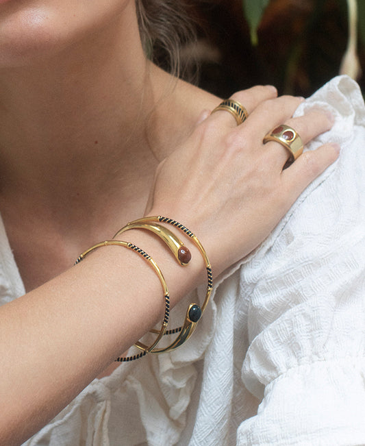 One of the most ancient forms of accessories, we designed our own version of a thin bangle so that it can be stacked or worn on its own. The irregular design of solid and striped sections gives it a playful and relaxed feel, this is accentuated when multiple are worn at the same style. Complete the total enamel look pairing multiple thin bangles with the Triple Band Eternity Ring with Striped Enamel Details.