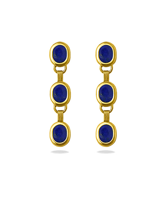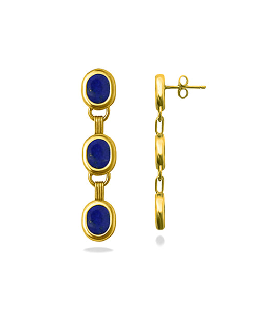 The Triple Station Earrings in Lapis Lazuil are expertly crafted from certified Recycled Sterling Silver with a 2.5mm 18kt Gold-Vermeil coating for a lasting golden finish.  The earrings measure 1 7/8" in length and  3/8" in width. Weight is 6 g per earring.