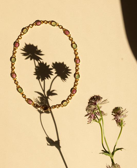 Aventurine and Rhodonite stones embellishing the delicate stations that make up the necklace. These are two semi-precious stone that will help with emotional balance and healing.