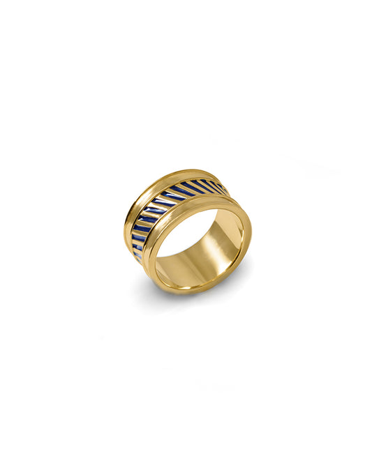 Expertly crafted from certified Recycled Sterling Silver with a 2.5mm 18kt Gold-Vermeil coating for a lasting golden finish, this ring has a 3/8" width and weighs 8g. This piece is hand painted with enamel details.