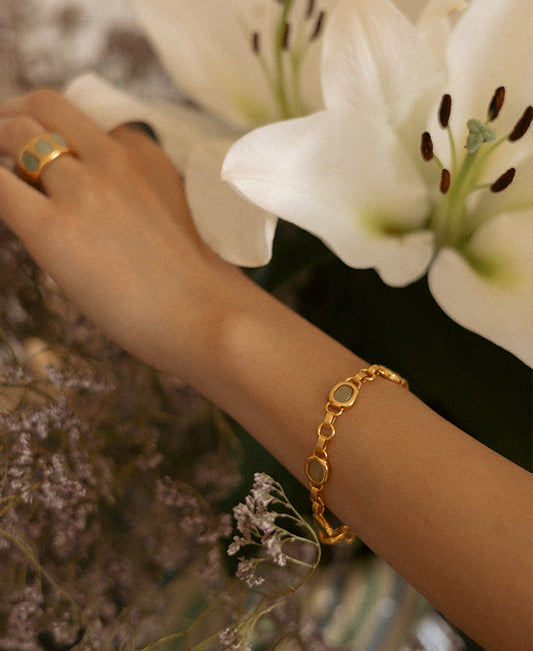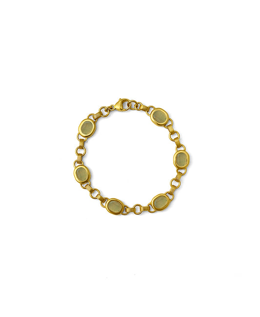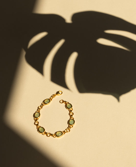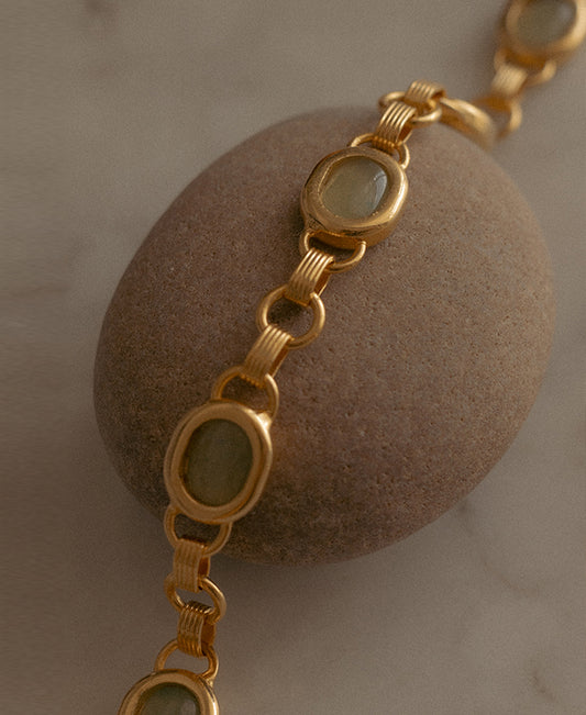Aventurine stones embellishing the delicate stations that make up the sections of the bracelet. This is a semi-precious stone that is meant to ease mental and emotional trauma, dissolve negative thoughts, and bring calm.