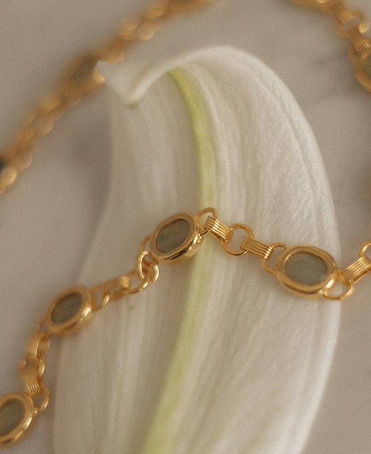 Aventurine stones embellishing the delicate stations that make up the sections of the bracelet. This is a semi-precious stone that is meant to ease mental and emotional trauma, dissolve negative thoughts, and bring calm.