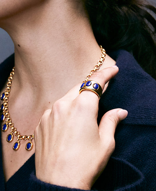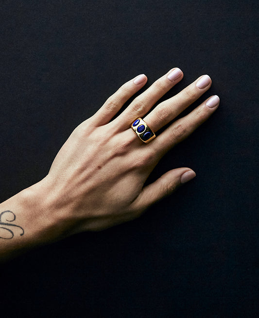 The Triple Lapis Lazuli Wide Ring is expertly crafted from certified Recycled Sterling Silver with a 2.5mm 18kt Gold-Vermeil coating for a lasting golden finish, this ring measures between 3/16" to 1/2" in width, and weighs 14 g.